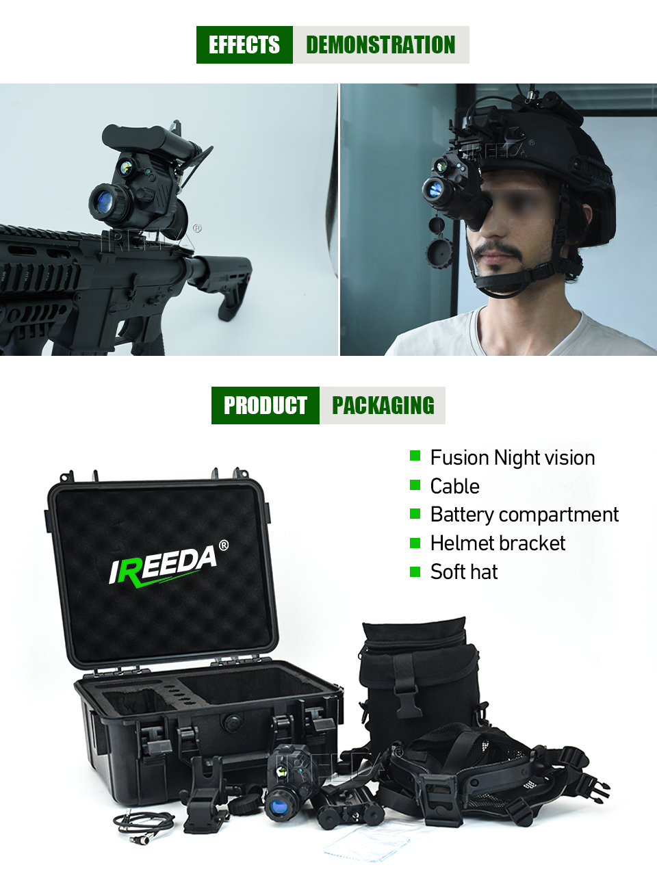 DA F-PVS14 is a fused night vision thermal monocular, which combines IIT and thermal technology. It can be used for observation and target search in extremely dark environment, night, raining, and other bad weather and adverse confitions, enable to recognize the potential risks and camouflage,it can be used by handheld,helmet mounted and equipped with your devices.