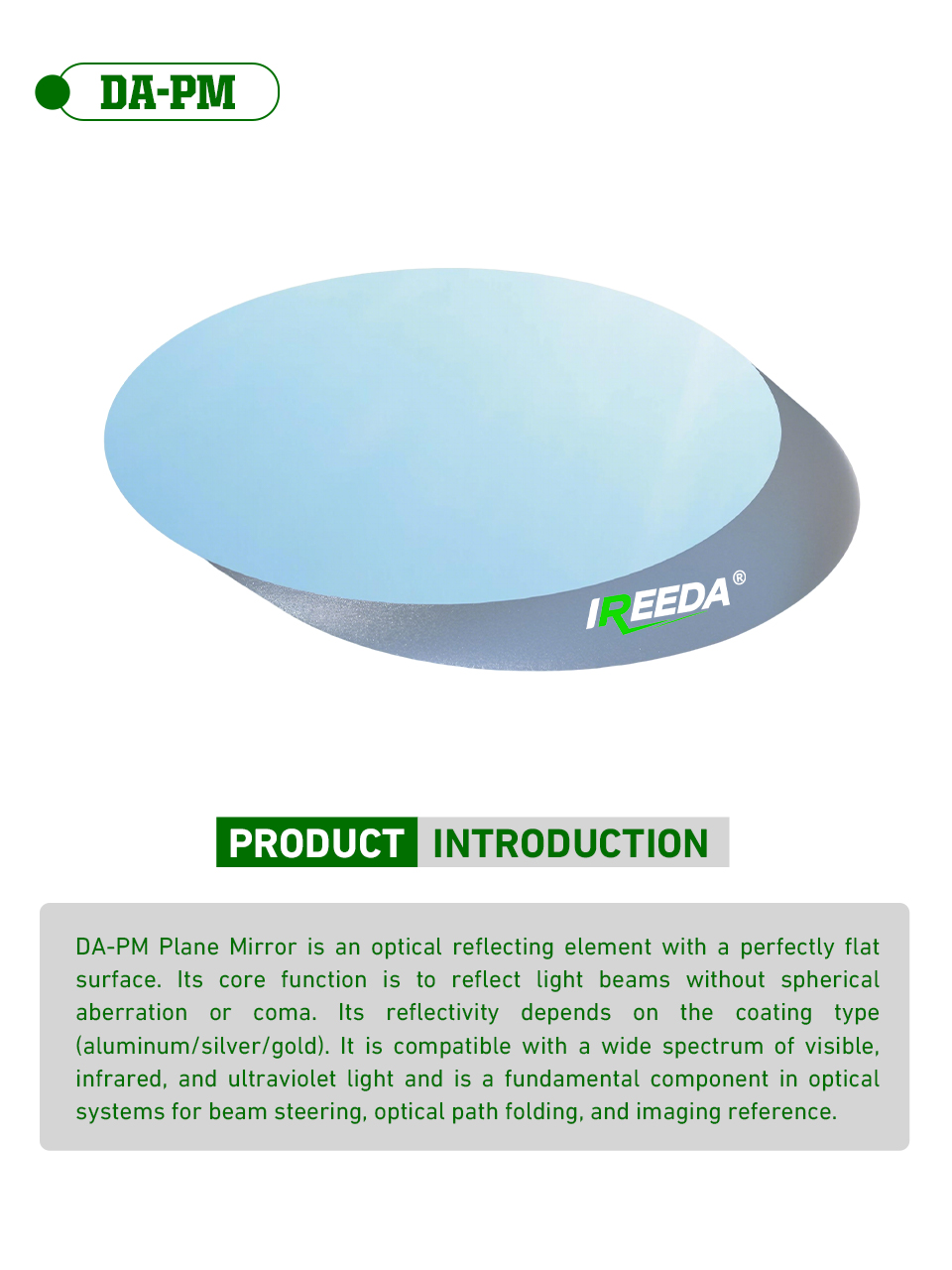 IREEDA plane mirror is a high-precision flat reflective optical component featuring an ultra-smooth surface that produces specular reflection. It follows the law of reflection strictly, ensuring that the angle of incidence equals the angle of reflection for all incident light rays. Unlike curved mirrors, it forms virtual, erect, and life-sized images with no magnification or distortion, making it ideal for applications requiring true-image reflection.