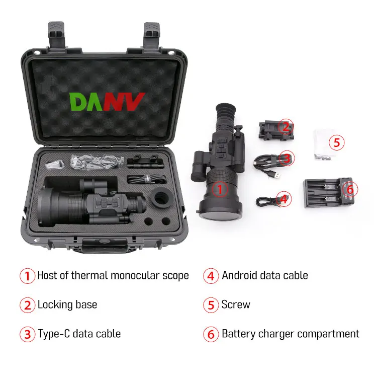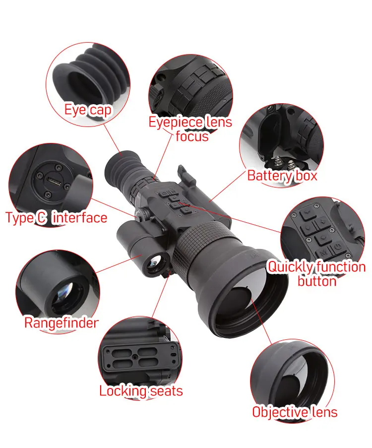 The product mainly consists of eyepieces, objective lenses, lens bodies, rangefinders, battery compartments, and locking seats.