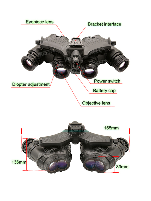 1.A four-eyed night vision device is equipped with four eyepiece lenses and four objective lenses. Each eye has two eyepieces, providing enhanced depth perception and improved situational awareness.The most striking feature of the GPNVG is the presence of four separate image intensifier tubes with four separate objective lenses arrayed in a panoramic orientation.